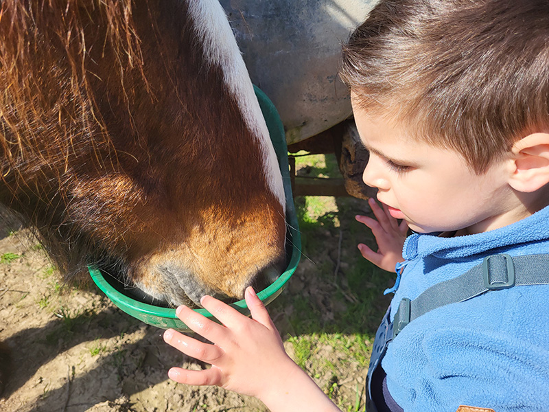Junge streichelt Pferd am Hals