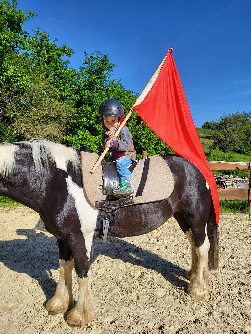 Ein kleines Kind sitzt mit einem Reithelm und einem leuchtend roten Fähnchen auf einem schwarz-weiß gefleckten Pferd.
