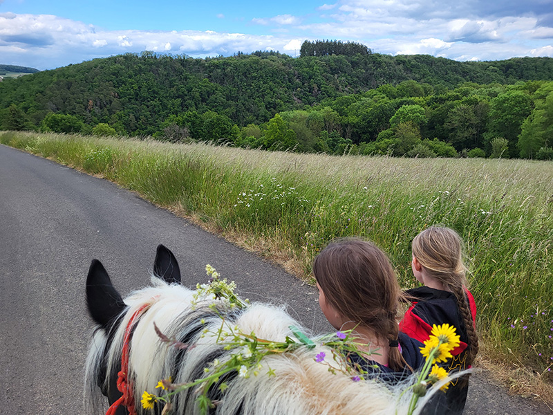 Eine erwachsene Person reitet auf einem großen, braun-weiß gescheckten Pferd und hält ein kleines Kind im roten Anorak vor sich im Sattel. Beide lächeln fröhlich in die Kamera, während das Pferd auf einem Feldweg unter weitem blauem Himmel steht.
