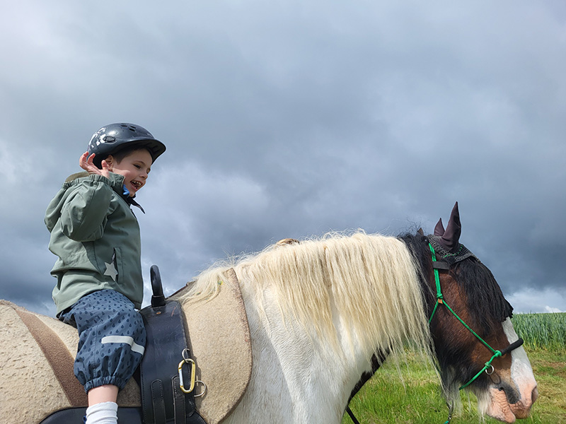 Ein kleines Kind mit Reithelm sitzt lächelnd auf dem Rücken eines braun-weißen Pferdes mit heller Mähne, unter einem dramatisch bewölkten Himmel.