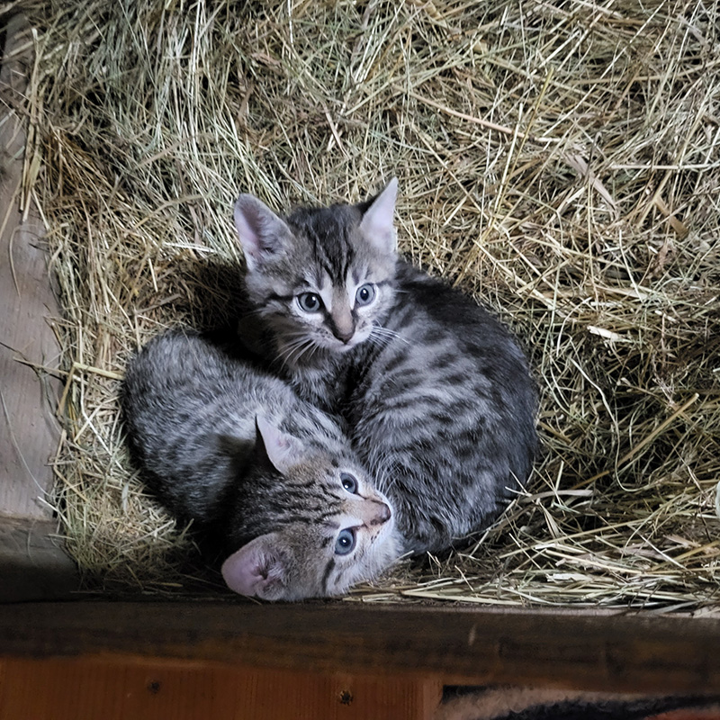Zwei kleine getigerte Kätzchen kuscheln im Heu