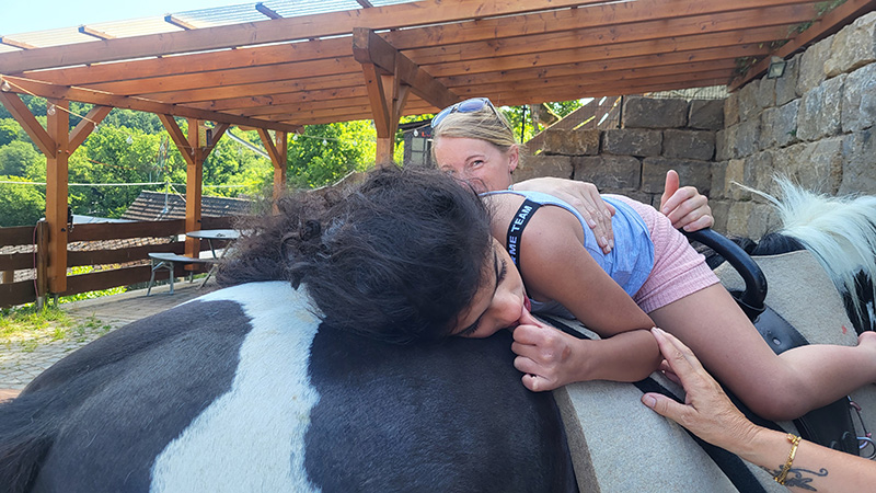 Eine junge Frau und ein Mädchen, die auf einem schwarz-weißen Pferd liegen und es umarmen, während eine helfende Hand im unteren rechten Bildbereich das Mädchen stützt.
