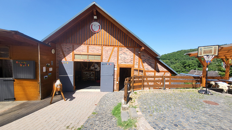 Das einladende Hauptstallgebäude der Pferdeinsel