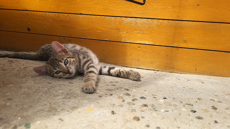 kleines Kätzchen vor gelber Holzwand