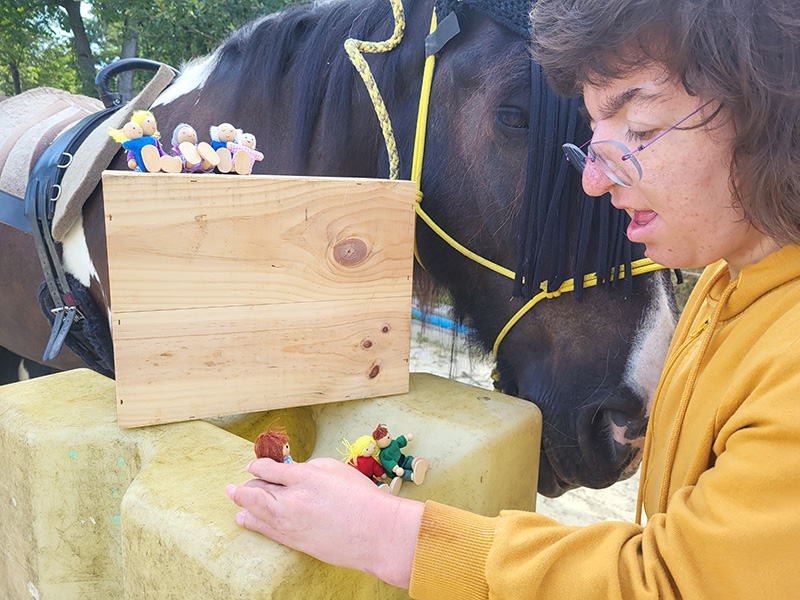 Eine junge Frau in einem gelben Kapuzenpullover spielt mit kleinen Holzfiguren auf gelben Blöcken vor einem Pferd. Das Pferd schaut der Frau mit seiner Fliegenmütze aufmerksam zu.