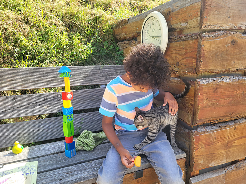 Ein Kind mit lockigem Haar sitzt auf einer Holzbank und streichelt eine grau-getigerte Katze, die auf seinem Schoß steht. Neben dem Kind befindet sich ein hoher Turm aus bunten Bauklötzen.
