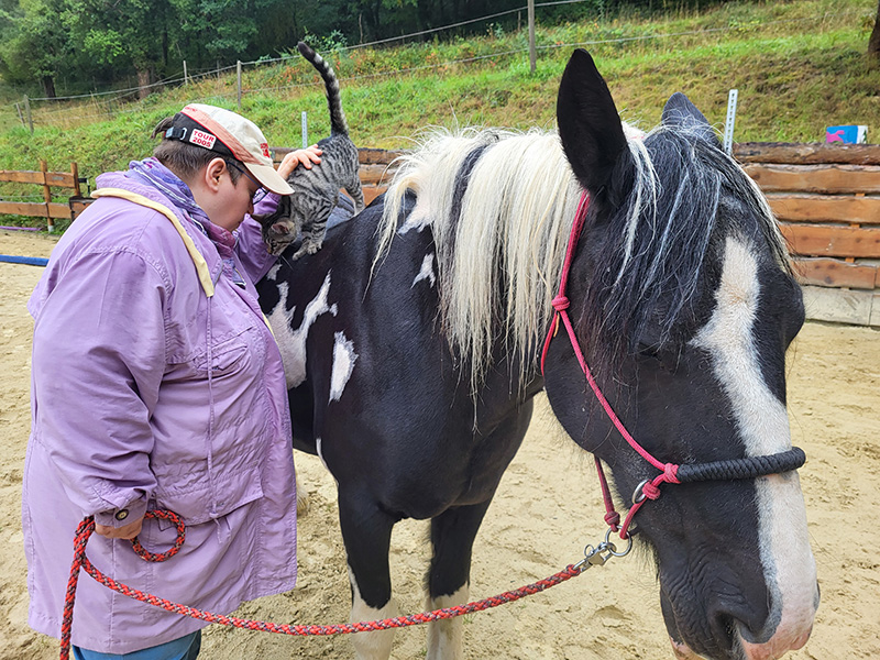 Eine Person in einer lilafarbenen Jacke steht neben einem schwarz-weißen Pferd