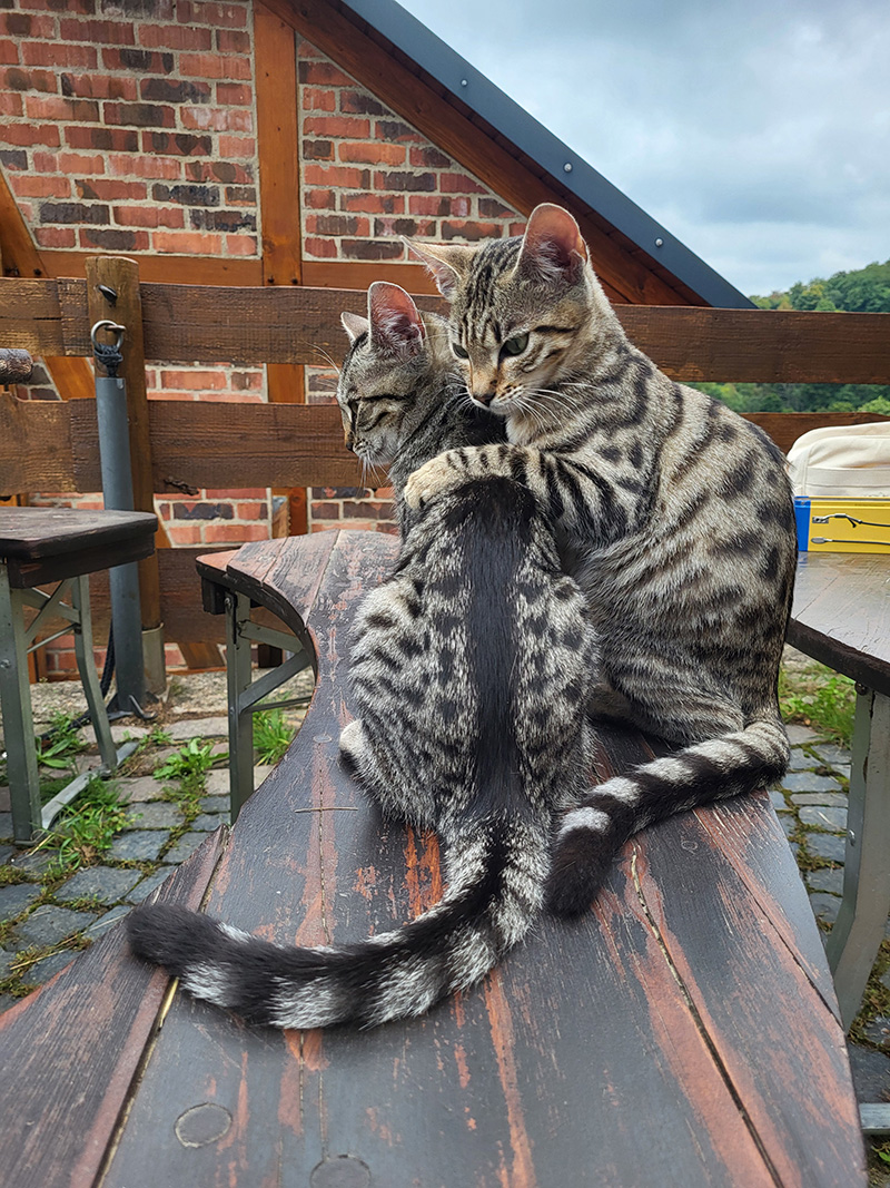 Die beiden getigerten Katzen Mimi und Momo sitzen eng beieinander auf einer dunklen Holzbank