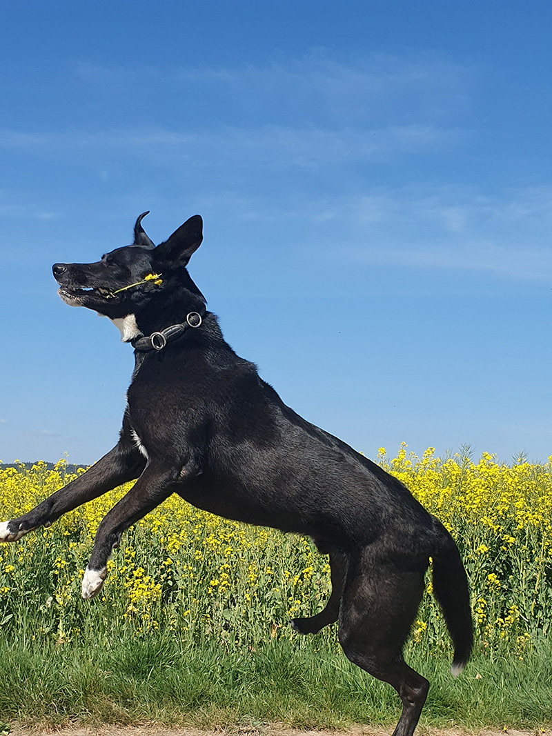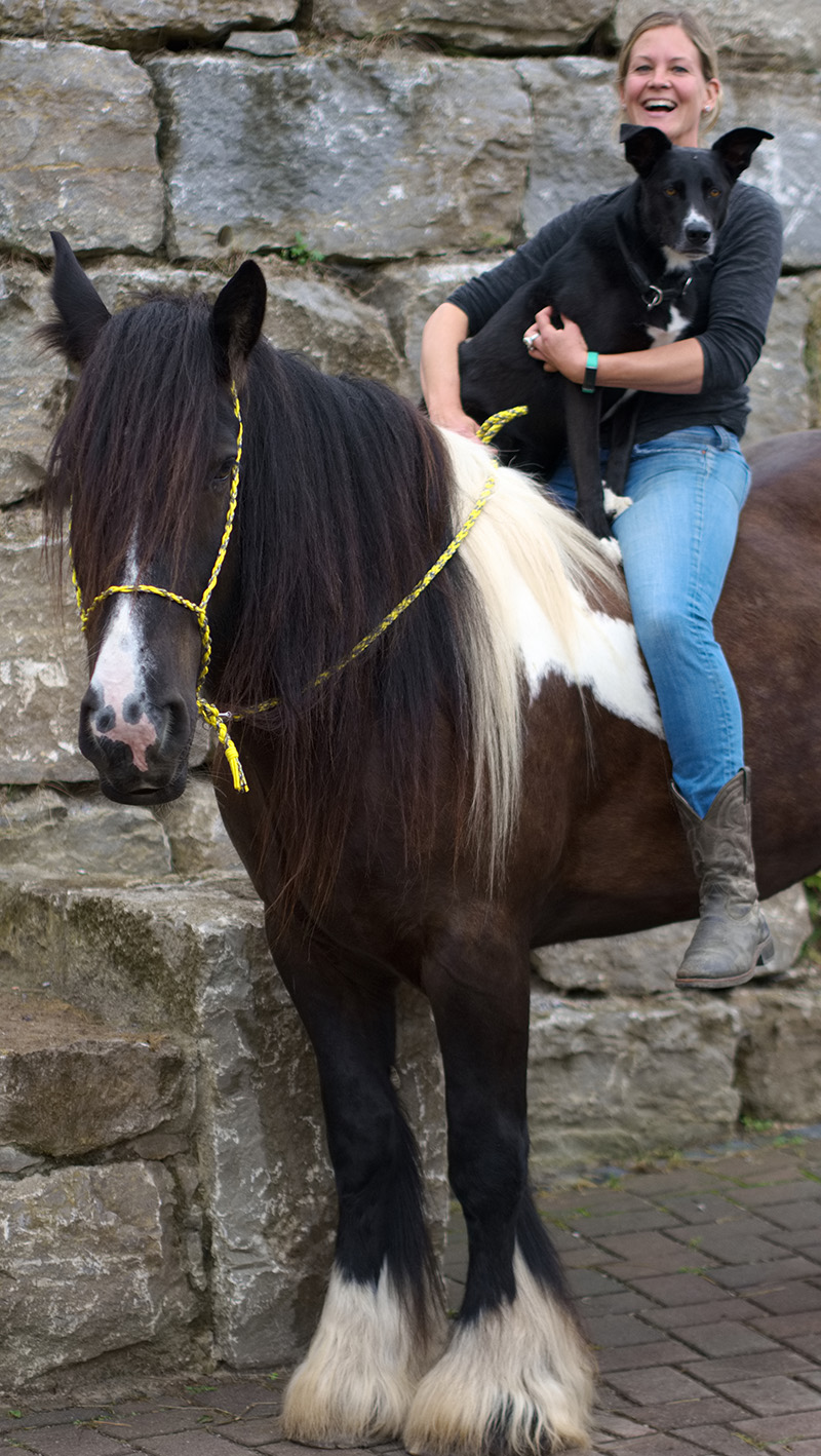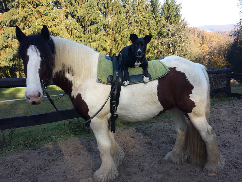 Hund Sam liegt auf Pferd Willi
