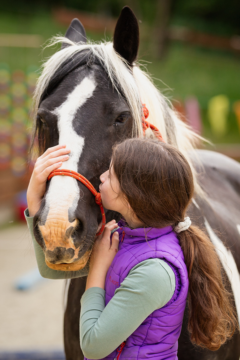 Ein Mädchen mit einem lila Weste und einem Pferdeschwanz umarmt liebevoll den Kopf eines schwarz-weißen Pferdes mit hellweißer Mähne.